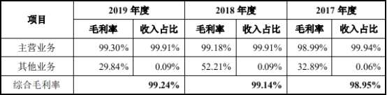2014年至2019年,盈建科綜合毛利率分別為93.96%、99.00%、98.71%、98.95%、99.14%、99.24%;其中,主營(yíng)業(yè)務(wù)毛利率分別為93.96%、99.00%、98.76%、98.99%、99.18%、99.30%。