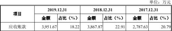 2014年至2019年,盈建科應(yīng)收賬款賬面價(jià)值分別為378.71萬(wàn)元、1669.76萬(wàn)元、3014.85萬(wàn)元、2787.63萬(wàn)元、3867.87萬(wàn)元、3951.67萬(wàn)元;占流動(dòng)資產(chǎn)的比例分別為18.31%、29.71%、29.98%、20.79%、22.91%、18.22%。
