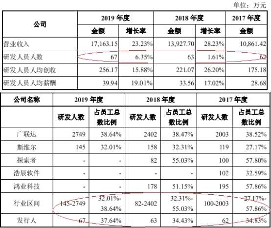 盈建科主營(yíng)業(yè)務(wù)為建筑結(jié)構(gòu)設(shè)計(jì)軟件的開發(fā)、銷售及相關(guān)技術(shù)服務(wù)。2016年至2019年,研發(fā)人員人數(shù)分別為53人、62人、63人、67人;行業(yè)區(qū)間分別為79-1691人、100-2003人、82-2402人、145-2749人。