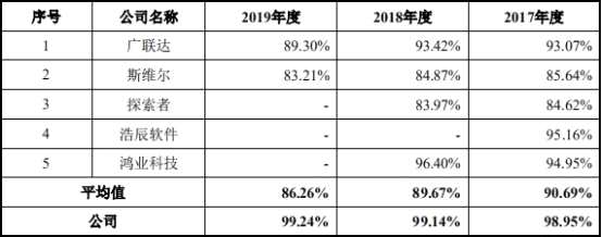 2014年至2019年,盈建科同行業(yè)可比公司毛利率均值分別為89.74%、91.98%、90.45%、90.69%、89.67%、86.26%。