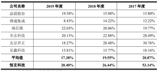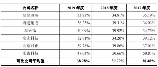 同期可比公司的毛利率均值為38.48%、39.79%和38.28%,恒玄科技2018年和2019年毛利率不及行業(yè)均值。