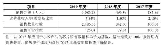 2017年至2019年,恒玄科技應(yīng)用于小米產(chǎn)品的芯片銷售金額分別為184.56萬(wàn)元、496.39萬(wàn)元、5086.27萬(wàn)元,占營(yíng)業(yè)收入比例分別為2.18%、1.50%和7.84%。