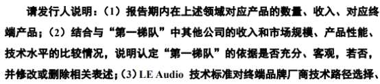在首次披露的招股書中,恒玄科技將自己稱為"國(guó)際領(lǐng)先的智能音頻SoC芯片設(shè)計(jì)企業(yè)之一",并穩(wěn)居行業(yè)"第一梯隊(duì)"。不過(guò)上交所很快就在首輪問(wèn)詢中,要求恒玄科技結(jié)合與“第一梯隊(duì)”中其他公司的收入和市場(chǎng)規(guī)模、產(chǎn)品性能、技術(shù)水平的比較情況,說(shuō)明認(rèn)定“第一梯隊(duì)”的依據(jù)是否充分、客觀。
