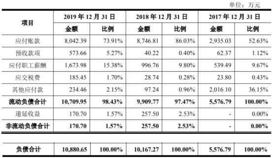 2017年至2019年各期末,恒玄科技的負(fù)債總額分別為5576.79萬(wàn)元、10,167.27萬(wàn)元和10,880.65萬(wàn)元,2018年末和2019年末負(fù)債增幅為82.31%、7.02%。負(fù)債中占比最高的為應(yīng)付賬款,分別為2935.03萬(wàn)元、8746.81萬(wàn)元和8042.39萬(wàn)元,占總負(fù)債的比例為52.63%、86.03%和73.91%。
