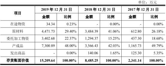 2017年至2019年,恒玄科技的存貨賬面價(jià)值分別為2341.14萬(wàn)元、8485.25萬(wàn)元及15,209.64萬(wàn)元,占總資產(chǎn)的比例分別為21.49%、39.33%和24.11%,主要由原材料、委托加工物資、產(chǎn)成品構(gòu)成。