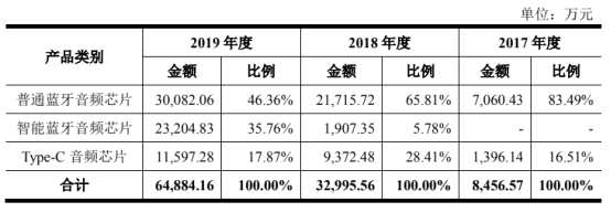 2017年至2019年,公司應(yīng)用于耳機(jī)產(chǎn)品的芯片銷售收入占比較高,分別為99.29%、93.20%和95.42%,而在非耳機(jī)市場(chǎng)形成的收入規(guī)模占營(yíng)業(yè)收入的比例相對(duì)較小,產(chǎn)品終端應(yīng)用形態(tài)呈現(xiàn)相對(duì)單一的特征。