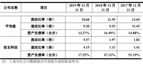上述同期,可比公司的資產(chǎn)負(fù)債率均值為14.88%、16.49%、13.37%,流動(dòng)比率均值分別為13.69、11.55、10.60,速動(dòng)比率均值分別為11.45、9.53和9.30。
