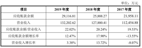 2017年至2019年,公司營收分別同比增長-8.07%、13.72%、3.38%,應(yīng)收賬款則分別同比增長-13.55%、17.90%、12.46%,公司應(yīng)收賬款漲幅遠(yuǎn)超營業(yè)收入。