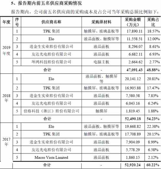 另外,2016年、2017年和2018年Elo同樣也為公司的第一大供應(yīng)商,采購金額為當(dāng)期總采購額的23.54%、22.38%、20.81%。2019年Elo為宸展光電的第二大供應(yīng)商,采購占比12.00%。