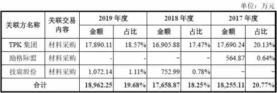 其中2016年至2019年,宸展光電向TPK集團(tuán)采購了1.59億元、1.77億元、1.69億元和1.79億元的產(chǎn)品,占宸展光電總采購金額的17.30%、20.15%、17.47%和18.57%。
