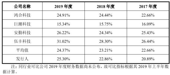 上述同期,4家可比公司主營業(yè)務(wù)毛利率均值分別為23.21%、22.66%、23.21%和24.37%,其中宸展光電的毛利率總體僅僅高于巨潮科技,低于安勤科技、伍豐科技和【鴻合科技(002955)、股吧】。