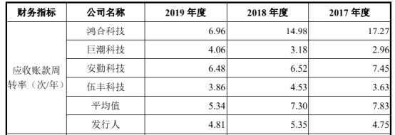 另外,宸展光電應(yīng)收賬款周轉(zhuǎn)率低于同行業(yè)平均水平。2016年至2019年,公司應(yīng)收賬款周轉(zhuǎn)率分別為5.11次/年、4.75次/年、5.35次/年、4.81次/年,同期行業(yè)均值則為8.82次/年、7.83次/年、7.3次/年、5.34次/年。