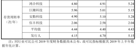 2016年末至2019年末,宸展光電對存貨分別計提跌價準(zhǔn)備214.42萬元、459.39萬元、543.93萬元和575.27萬元。同期公司的存貨周轉(zhuǎn)率分別為7.10次/年、5.15次/年、4.70次/年和4.15次/年,可比公司的存貨周轉(zhuǎn)率均值為4.51次/年、4.43次/年、4.40次/年和4.44次/年。