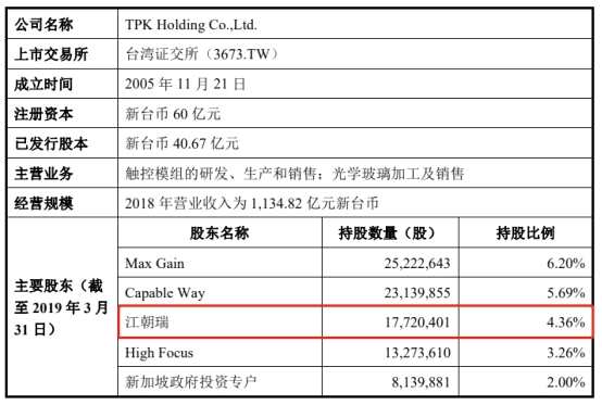 實控人江朝瑞為加拿大國籍,曾擔(dān)任臺灣錄霸股份有限公司總經(jīng)理,鈦積創(chuàng)新董事長,宸展有限董事。自2006年起擔(dān)任TPKHolding董事長,現(xiàn)任公司董事,任期為2018年5月至2021年5月;兼任宸展貿(mào)易董事,薩摩亞宸展董事,香港宸展董事,宸鴻光電董事長,宸鴻科技(廈門)有限公司執(zhí)行董事,寶宸光學(xué)執(zhí)行董事,宸齊(廈門)光電科技有限公司執(zhí)行董事等職務(wù)。