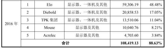 公司成立于2015年4月,招股書披露,2015年公司就和主要境外客戶包括Elo、Diebold、Mouse、Acrelec和TPK集團(tuán)合作,2016年上述5名客戶就貢獻(xiàn)了10.84億元的收入,占營收比例高達(dá)88.63%。