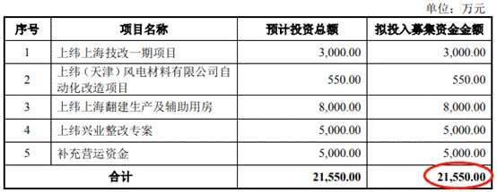 上緯新材原擬募集資金凈額為2.16億元,分別用于上緯上海技改一期項(xiàng)目、上緯(天津)風(fēng)電材料有限公司自動(dòng)化改造項(xiàng)目、上緯上海翻建生產(chǎn)及輔助用房、上緯興業(yè)整改專(zhuān)案、補(bǔ)充營(yíng)運(yùn)資金。公司實(shí)際募集資金僅為原擬募集資金的32.50%。
