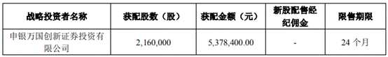 上緯新材上市發(fā)行公告顯示,保薦機(jī)構(gòu)的子公司申銀萬(wàn)國(guó)創(chuàng)新證券投資有限公司跟投比例為本次發(fā)行規(guī)模的5%,獲配216萬(wàn)股,獲配金額537.84萬(wàn)元,限售期限24個(gè)月。