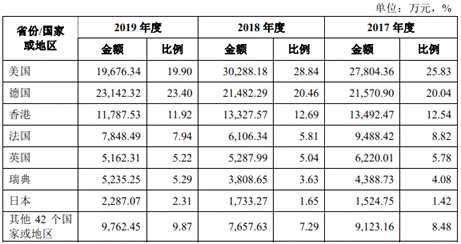 公司的境外銷售主要集中在美國、德國、中國香港、法國、英國、瑞典、日本等發(fā)達國家或地區(qū)。其中,野馬電池出口到美國的銷售收入分別為26,211.43萬元、27,804.36萬元、30,288.18萬元和19,676.34萬元,占當(dāng)年營業(yè)收入的比例為29.19%、25.83%、28.84%和19.90%。