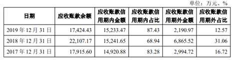 2017年至2019年各期末,公司應(yīng)收賬款信用期外金額分別為3994.72萬元、6865.52萬元和2190.97萬元,占比分別為16.72%、31.06%和12.57%。