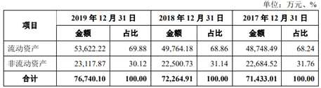 2016年至2019年,野馬電池的資產(chǎn)總額分別為61,850.02萬元、71,433.01萬元、72,264.91萬元和76,740.10萬元,其中流動資產(chǎn)42,301.27萬元、48,748.49萬元、49,764.18萬元和53,622.22萬元,占比68.39%、68.24%、68.86%和69.88%。