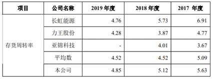 2016年至2019年各期末,公司的存貨周轉(zhuǎn)率分別為4.67、5.63、5.12和4.85,同行業(yè)可比公司的存貨周轉(zhuǎn)率均值分別為5.38、5.09、4.52和4.52。