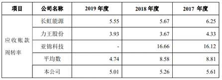 2016年至2019年各期末,公司的應(yīng)收賬款周轉(zhuǎn)率分別為5.55、5.61、5.26和5.01,同行業(yè)可比公司的應(yīng)收賬款周轉(zhuǎn)率均值分別為4.51、8.81、8.58和4.74。
