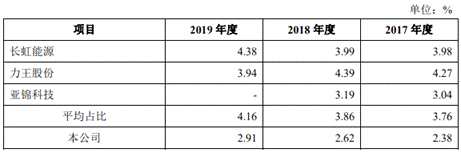 2017年至2019年,同行業(yè)可比公司的研發(fā)費用率均值分別為3.76%、3.86%和4.16%,各期均高于野馬電池。