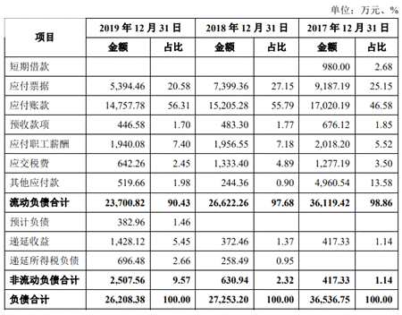 公司的流動負債主要由應(yīng)付票據(jù)、應(yīng)付賬款構(gòu)成。2016年至2019年各期末,公司應(yīng)付票據(jù)余額分別為3886.42萬元、9187.19萬元、7399.36萬元和5394.46萬元,占負債的比例分別為14.04%、25.15%、27.15%和20.58%。