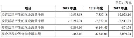 2016年至2019年,公司銷售商品、提供勞務(wù)收到的現(xiàn)金分別為85,779.87萬元、111,817.71萬元、103,680.30萬元和105,747.70萬元,同期經(jīng)營活動產(chǎn)生的現(xiàn)金流量凈額11,547.41萬元、12,023.10萬元、7337.18萬元、19,533.58萬元。