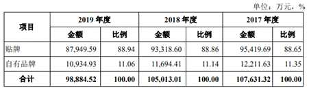 2017年至2019年,野馬電池為家樂福、樂購、松下、麥德龍等客戶所生產(chǎn)的貼牌產(chǎn)品,占總收入的比例分別為88.65%、88.86%和88.94%,占比一直維持在近9成,自有品牌營收僅占1成。