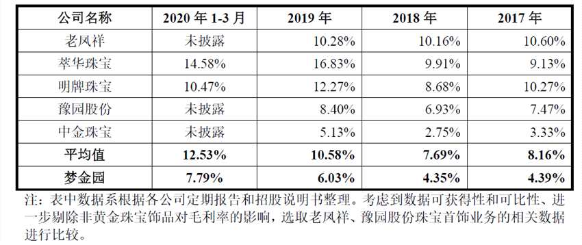 據(jù)招股書介紹,研發(fā)費用占比較低是黃金珠寶行業(yè)的普遍特點。在研發(fā)方面發(fā)力較小或為該行業(yè)產(chǎn)品同質(zhì)化嚴(yán)重,毛利率水平較低,市場競爭嚴(yán)重的原因之一。盡管如此,夢金園綜合毛利率仍顯著低于同業(yè)公司平均水平。報告期內(nèi),公司綜合毛利率分別為4.39%、4.35%、6.03%和7.79%,僅為同行業(yè)可比公司的一半左右,招股書中解釋稱差異主要系產(chǎn)品結(jié)構(gòu)、銷售模式及品牌溢價等方面不同所致。