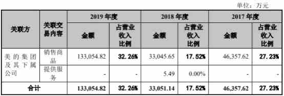 各期,美的集團(tuán)及其下屬公司為公司第一大客戶。2017年-2019年,公司向美的集團(tuán)及其下屬公司銷售收入分別為4.64億元、3.31億元、13.31億元,占公司營(yíng)業(yè)收入的比例分別為27.23%、17.52%及32.26%。