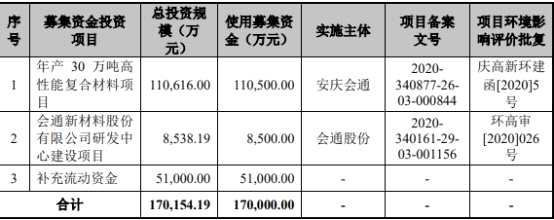 會(huì)通股份最終募集資金凈額較原計(jì)劃少13.72億元。招股說明書顯示,公司擬募集資金17.00億元,分別用于年產(chǎn)30萬噸高性能復(fù)合材料項(xiàng)目、會(huì)通新材料股份有限公司研發(fā)中心建設(shè)項(xiàng)目、補(bǔ)充流動(dòng)資金。