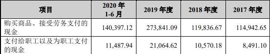 各期,會(huì)通股份銷售商品、提供勞務(wù)收到的現(xiàn)金始終遠(yuǎn)落后于同期營(yíng)收,經(jīng)營(yíng)活動(dòng)產(chǎn)生的現(xiàn)金流量?jī)纛~則2年半為負(fù)。