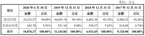 2017年至2020年6月30日,霍萊沃總資產(chǎn)分別為1.33億元、1.41億元、2.90億元、2.65億元,總負(fù)債分別為9120.90萬(wàn)元、6932.65萬(wàn)元、1.12億元、1.09億元。
