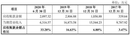 2017年至2020年6月30日,霍萊沃應(yīng)收賬款賬面余額分別為339.64萬(wàn)元、1056.88萬(wàn)元、2806.88萬(wàn)元和2097.32萬(wàn)元,占同期營(yíng)業(yè)收入的比例分別為3.47%、6.80%、16.63%和33.20%。