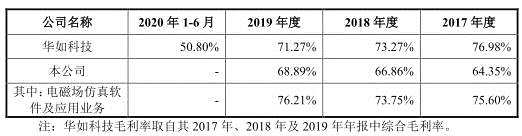 2017年至2019年,公司電磁場(chǎng)仿真分析驗(yàn)證業(yè)務(wù)毛利率分別為64.35%、66.86%、68.89%,低于可比公司華如科技業(yè)務(wù)毛利率76.98%、73.27%、71.27%。