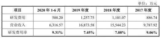 2017年至2020年1-6月,霍萊沃研發(fā)費(fèi)用分別為886.74萬(wàn)元、1101.07萬(wàn)元、1257.75萬(wàn)元和588.20萬(wàn)元,占各年度營(yíng)業(yè)收入的比例分別為9.06%、7.08%、7.45%和9.31%。