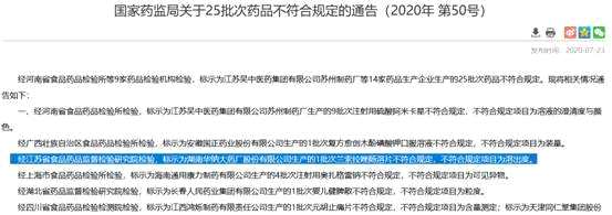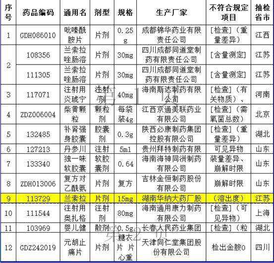 今年7月23日,國家藥監(jiān)局發(fā)布的《國家藥監(jiān)局關于25批次藥品不符合規(guī)定的通告》顯示,經(jīng)江蘇省食品藥品監(jiān)督檢驗研究院檢驗,標示為湖南華納大藥廠股份有限公司生產(chǎn)的1批次蘭索拉唑腸溶片不符合規(guī)定,不符合規(guī)定項目為溶出度。