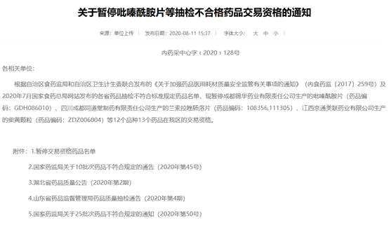 通知顯示,根據(jù)自治區(qū)食藥監(jiān)局和自治區(qū)衛(wèi)生計生委聯(lián)合發(fā)布的《關于加強藥品醫(yī)用耗材質(zhì)量安全監(jiān)管有關事項的通知》(內(nèi)食藥監(jiān)〔2017〕259號)及2020年7月國家食藥總局網(wǎng)站發(fā)布的各省藥品抽檢不符合標準規(guī)定藥品名單,現(xiàn)暫停成都錦華藥業(yè)有限責任公司生產(chǎn)的吡嗪酰胺片(藥品編碼:GDH086010)、四川成都同道堂制藥有限責任公司生產(chǎn)的蘭索拉唑腸溶片(藥品編碼:108356,111305)、江西京通美聯(lián)藥業(yè)有限公司生產(chǎn)的柴黃顆粒(藥品編碼:ZDZ006004)等12個品種13個藥品在我區(qū)的交易資格。