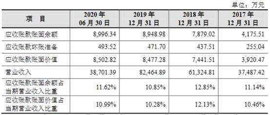 2017年末、2018年末、2019年末和2020年6月末,華納藥廠應收賬款賬面價值分別為3920.47萬元、7441.51萬元、8477.28萬元和8502.82萬元,占當期營業(yè)收入比重分別為10.46%、12.13%、10.28%、10.99%。相應的壞賬準備為255.04萬元、437.51萬元、471.7萬元、493.52萬元。