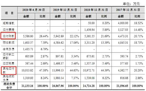 報告期各期末,公司其他應付款余額分別為4362.77萬元、1.10億元、1.20億元和1.00億元,占各期末流動負債總額的比例分別為20.20%、44.39%、44.65%和47.38%。
