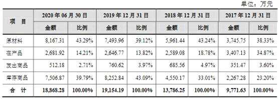 報告期各期末,公司存貨賬面價值分別為9771.63萬元、1.38億元、1.92億元和1.89億元,占流動資產(chǎn)的比例分別為46.78%、47.44%、48.37%和57.21%。