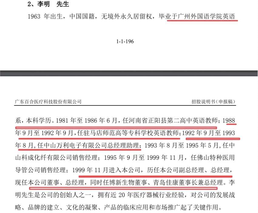 百合醫(yī)療現(xiàn)任董事、總經(jīng)理李明簡(jiǎn)歷的信息披露也是如此。百合醫(yī)療創(chuàng)業(yè)板招股書(shū)披露如下,似乎也違反了上述規(guī)定。