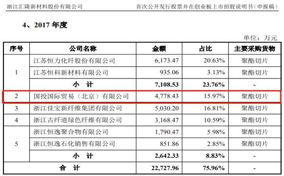 另外,招股書還顯示,2017年國投國際貿(mào)易(北京)有限公司、浙江古纖道綠色纖維有限公司分別是2017年匯隆新材的第二、四供應(yīng)商,匯隆新材向其分別采購4,778.43萬元、3,168.47萬元,采購占比分別為15.97%、10.59%。而2017年新三板年報則顯示向國投國際采購金額為5,113.81萬元、采購占比為16.21%,向綠色纖維采購金額為3,783.45萬元、采購占比為11.99%。