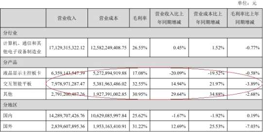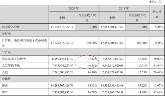 2020年,視源股份液晶顯示主控板卡占營業(yè)收入比重為37.12%,交互智能平板占營業(yè)收入比重為46.58%。