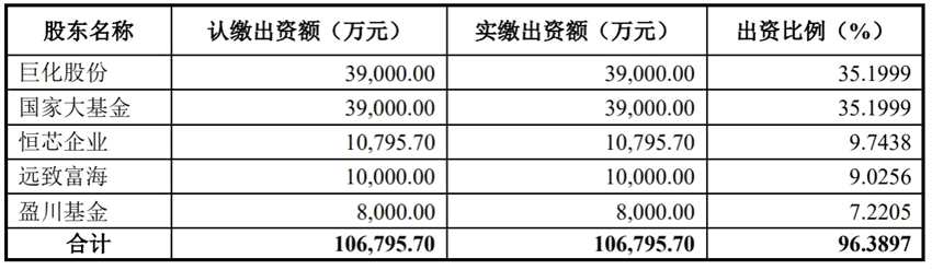目前,中巨芯共有7名股東,前兩大股東分別為巨化股份、國家大基金,持股比例均為35.1999%。