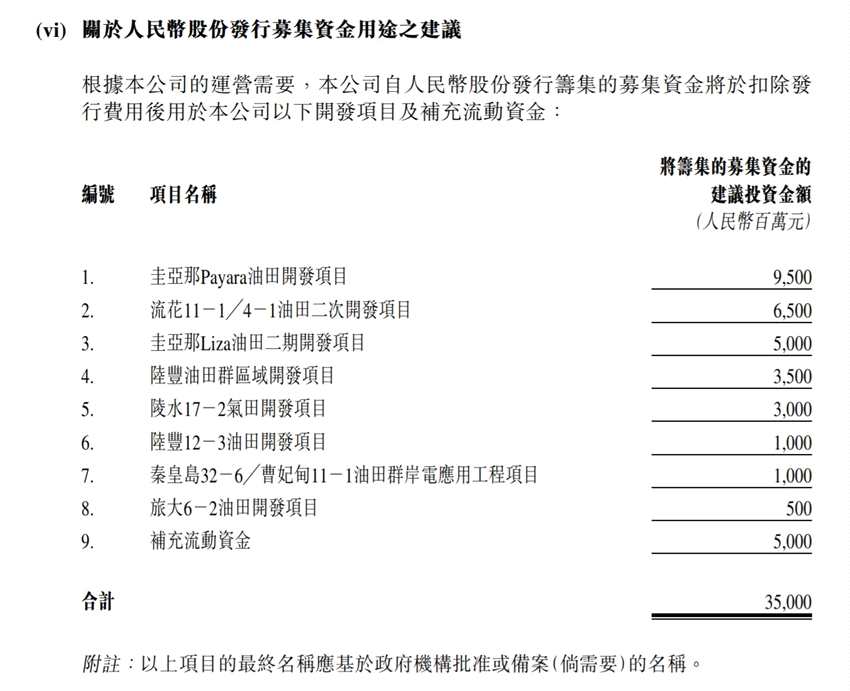 此次回A,中國海洋石油擬募集資金不超過350億元人民幣,擬用于包括圭亞那Payara油田、流花11-1/4-1油田、陵水17-2氣田等在內(nèi)的國內(nèi)外多個油、氣田開發(fā)項目,以及補充流動資金。