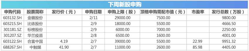 根據(jù)發(fā)行安排,下周(2月7日-2月11日)有6只新股發(fā)行,包括滬市主板3只、創(chuàng)業(yè)板2只、科創(chuàng)板1只。具體日程安排上,下周集中申購(gòu)在周一和周三,周一可申購(gòu)合富中國(guó)、【中觸媒(688267)、股吧】科這2只個(gè)股,周三可申購(gòu)標(biāo)榜股份、比依股份這2只個(gè)股。