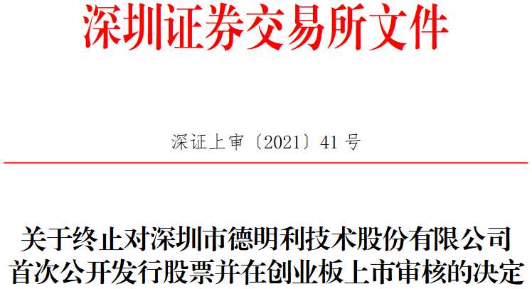 2021年2月5日,德明利向深交所提交了《深圳市德明利技術(shù)股份有限公司關(guān)于首次公開(kāi)發(fā)行股票并在創(chuàng)業(yè)板上市終止審核的申請(qǐng)》,保薦人向深交所提交了《東莞證券股份有限公司關(guān)于深圳市德明利技術(shù)股份有限公司首次公開(kāi)發(fā)行股票并在創(chuàng)業(yè)板上市終止審核的申請(qǐng)》。根據(jù)《深圳證券交易所創(chuàng)業(yè)板股票發(fā)行上市審核規(guī)則》第六十七條的有關(guān)規(guī)定,深交所決定終止對(duì)德明利首次公開(kāi)發(fā)行股票并在創(chuàng)業(yè)板上市的審核。